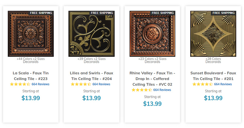 Now comes the fun part, finding a tileset in the perfect color or sporting an ideal pattern that best compliments your interior design style. From ornate, faux-tin ceiling tiles (as opposed to real tin ceiling tiles) in deep golden shades to evoke a sense of classical elegance, to powder-coated tin ceiling tiles available in a wide range of muted and bold colors, there are loads of options to choose from on our site.