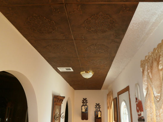 Another concern is noise. The sound in quiet spaces can be amplified when the ceiling or other surfaces are treated with tin or other metals. And in rooms intended for high volumes, such as performance venues, metallic tile can be a nightmare. Metals such as tin tend to brighten sounds and produce a surplus of echo. But faux ceiling tiles generally don’t suffer from these issues.