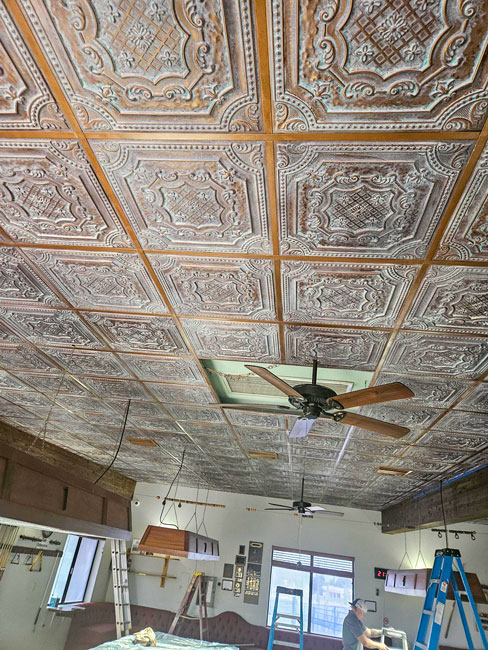 - Painted Finish: The ceiling grids were painted with hammered copper paint from Home Depot, complementing the metallic tones of the Decorative Ceiling Tiles.