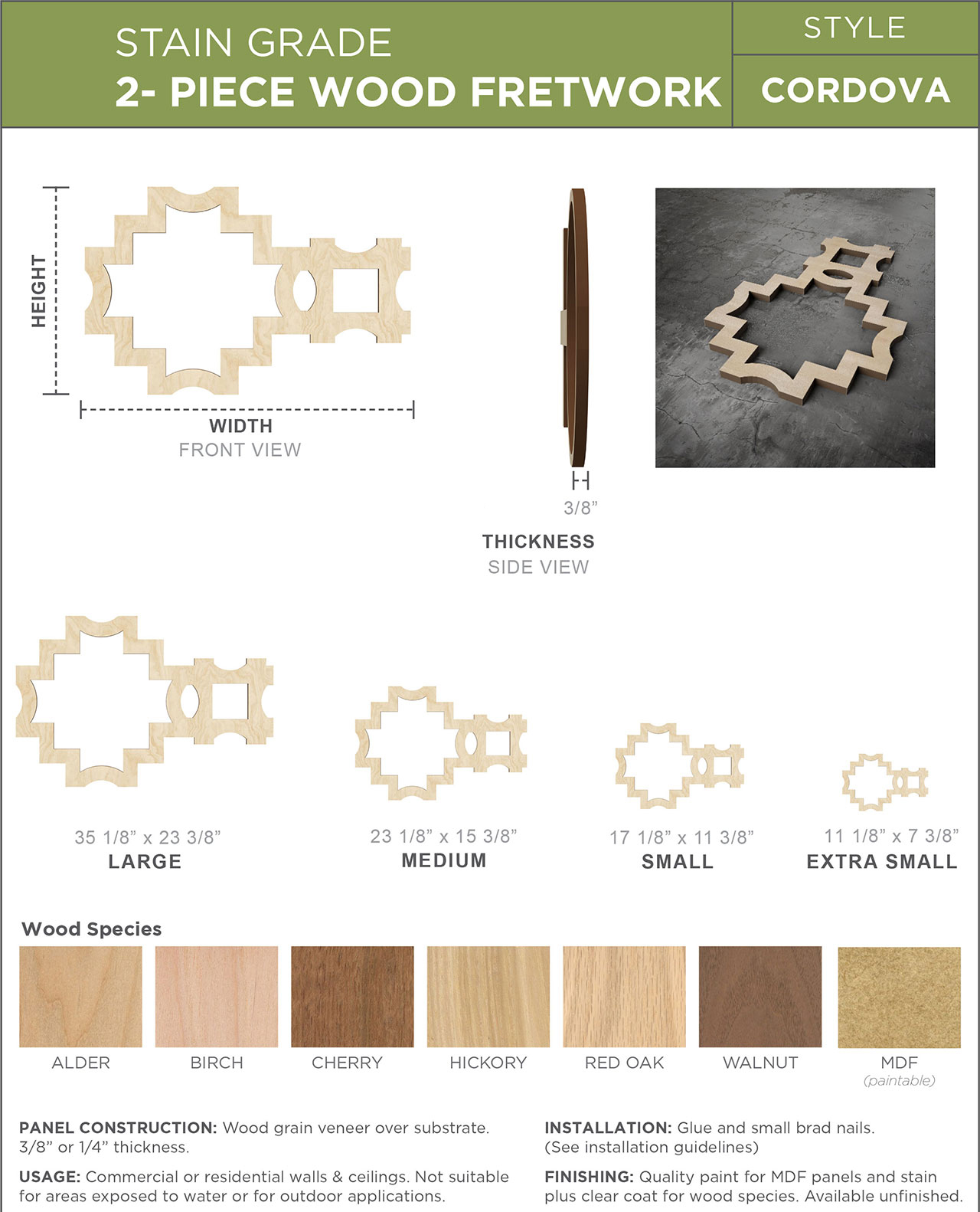 Available in paint-grade, oak, cherry, alder, walnut, hickory, and birch allowing for great strength and durable usage. The natural wood tones evoke luxury and sophistication in any space. You can leave your design mark with unique and inspiring effects on your walls, cabinetry, ceilings and more. Our easy-to-install wood panels can turn a room into a work of art in no time at all. Our distinctive wood fretwork panels add instant value to your home and stand apart from everything else on the market.