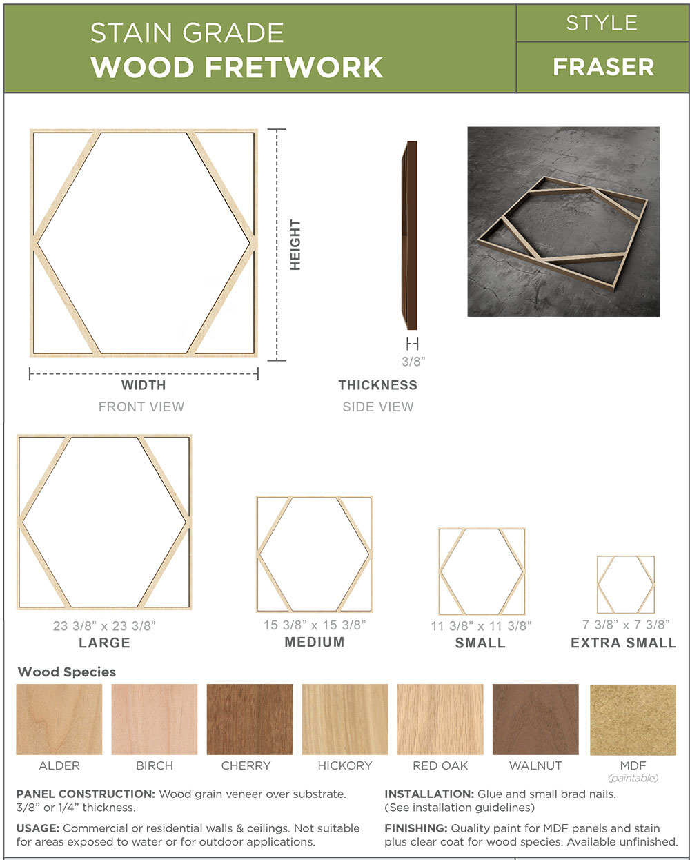 Available in paint-grade, oak, cherry, alder, walnut, hickory, and birch allowing for great strength and durable usage. The natural wood tones evoke luxury and sophistication in any space. You can leave your design mark with unique and inspiring effects on your walls, cabinetry, ceilings and more. Our easy-to-install wood panels can turn a room into a work of art in no time at all. Our distinctive wood fretwork panels add instant value to your home and stand apart from everything else on the market.