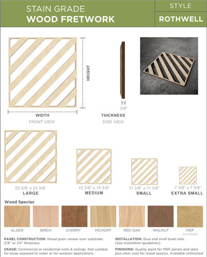 Available in paint-grade, oak, cherry, alder, walnut, hickory, and birch allowing for great strength and durable usage. The natural wood tones evoke luxury and sophistication in any space. You can leave your design mark with unique and inspiring effects on your walls, cabinetry, ceilings and more. Our easy-to-install wood panels can turn a room into a work of art in no time at all. Our distinctive wood fretwork panels add instant value to your home and stand apart from everything else on the market.