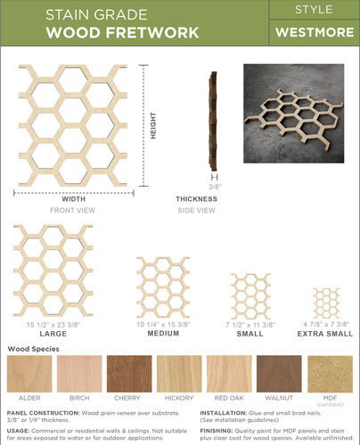Available in paint-grade, oak, cherry, alder, walnut, hickory, and birch allowing for great strength and durable usage. The natural wood tones evoke luxury and sophistication in any space. You can leave your design mark with unique and inspiring effects on your walls, cabinetry, ceilings and more. Our easy-to-install wood panels can turn a room into a work of art in no time at all. Our distinctive wood fretwork panels add instant value to your home and stand apart from everything else on the market.