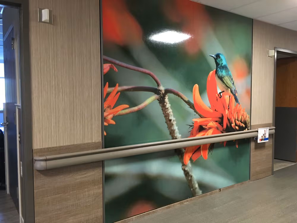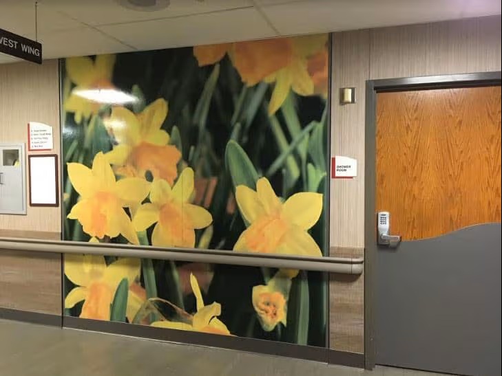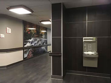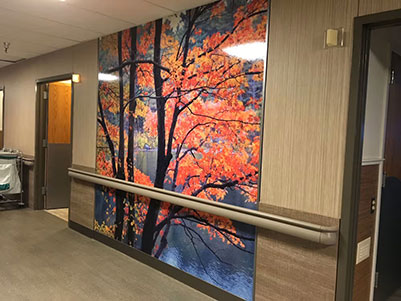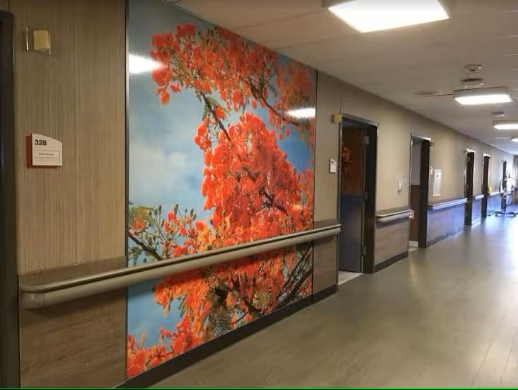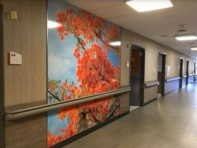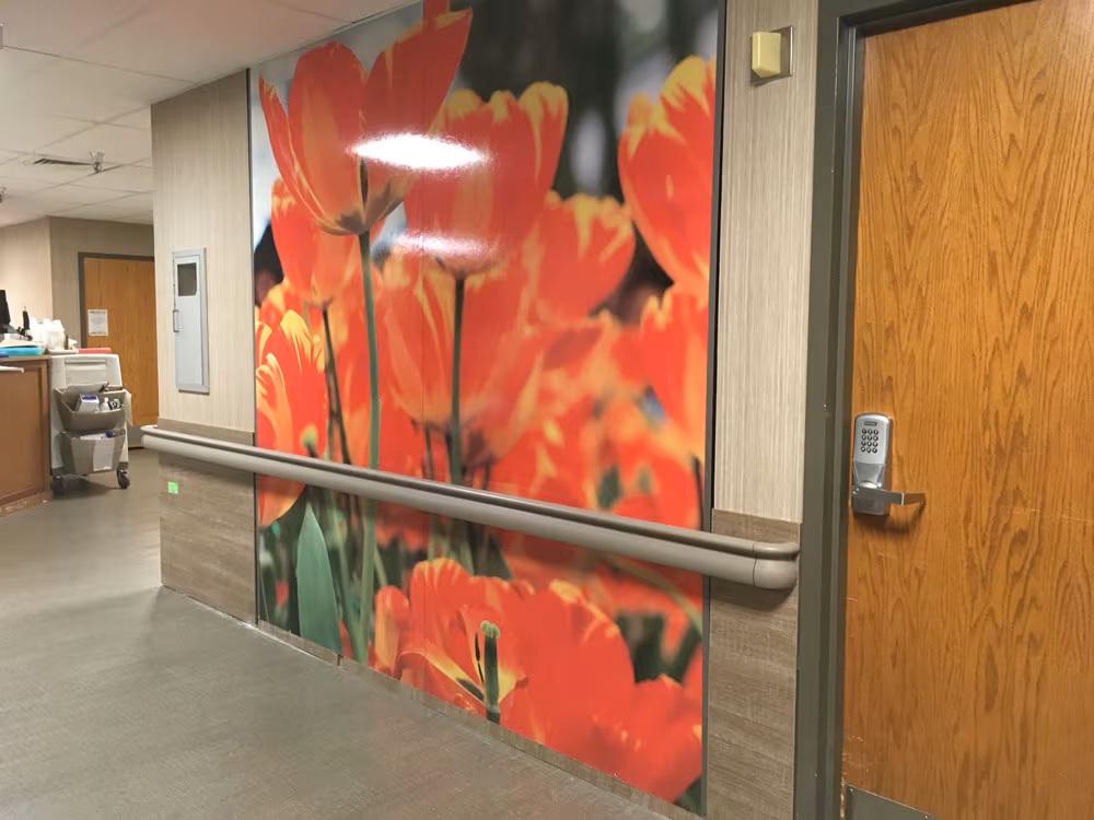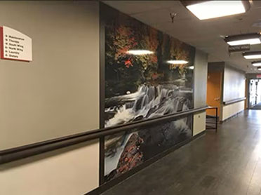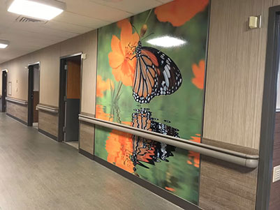 There were multiple goals for this project. Apart from the fact that I wanted nature-inspired photographic murals to adorn the hallways, I needed a product that would withstand the constant abuse from the foot pads of wheel chairs that residents wheel themselves in, as well as the large food/medicine carts that are constantly moving through the hallways. I was also looking for a product slim enough so that it wouldn’t protrude into the existing floor space and it obviously had to be Class A fire rated. ATI’s Fusion product allowed me to bring both beauty and function together!