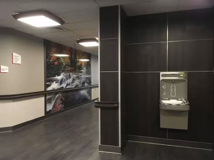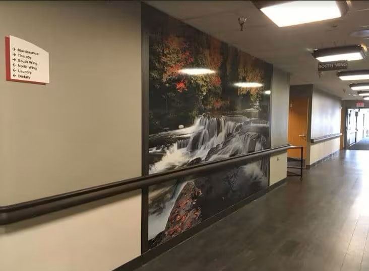 Update the facility’s institutional interior corridors to be more welcoming, warm, and nature-inspired, improving the ambience for residents, staff and visitors. Use durable, slim-profile wall panels so hallways remain fully accessible to wheelchairs and service carts, without protrusions into the walking path. Ensure the materials used are safe, long-lasting, easy to maintain, and suitable for a high-traffic healthcare environment.
